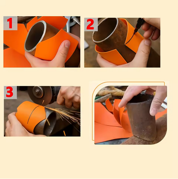 Sabloanele se infasoara usor in jurul tevii, permitand trasarea unui contur corect, fara calcule sau masuratori complicate.